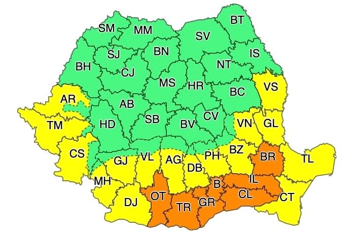 În județele Dolj, Olt, Teleorman, Giurgiu, Călărași, Ialomița, Brăila, Ilfov și municipiul București se vor înregistra temperaturi maxime de 37...39 de grade. Disconfortul termic va fi accentuat, iar indicele temperatură-umezeală (ITU) se va situa peste pragul critic de 80 de unități.