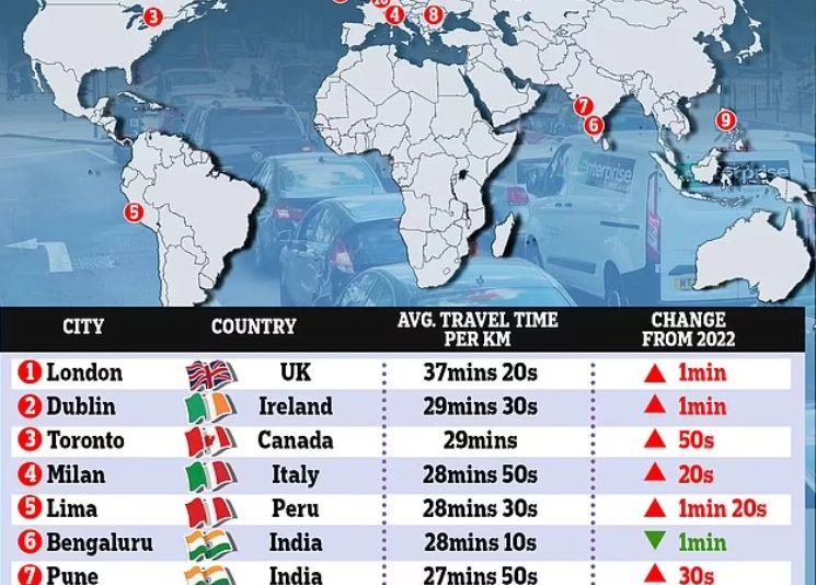Acest top inedit a fost realizat de o companie de navigație prin satelitși publicat pe DailyMail. Londra, campionul agoniei rutiere, este urmat în acest top al rușinii de Dublin, unde șoferii au de îndurat în medie 29 de minute și 30 de secunde pentru a parcurge 10 kilometri.