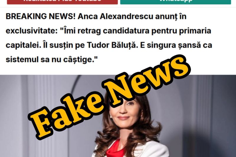 Captura de ecran lansată pe rețelele de socializare arată un presupus BREAKING NEWS transmis de realitatea.net, în care Anca Alexandrescu anunță că a decis să se retragă din cursa pentru Primăria Generală și le recomandă susținătorilor săi să îl voteze pe „TUDOR” Băluță.